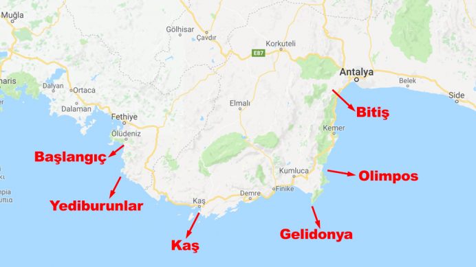 Kaş, Kalkan ve Fethiye çevresinde rotaların başlangıç noktalarına araçla ulaşmak kolaydır.