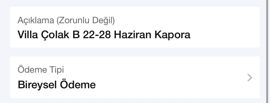 Açıklama kısmına seçmiş olduğunuz villamızın ismi - tarihleriniz ve ödeme seçeneğiniz " ön ödeme, kapora, toplam tutar ödemesi vb." olarak belirttiğiniz takdirde hukuki olarak haklarınızı da korumuş olursunuz.